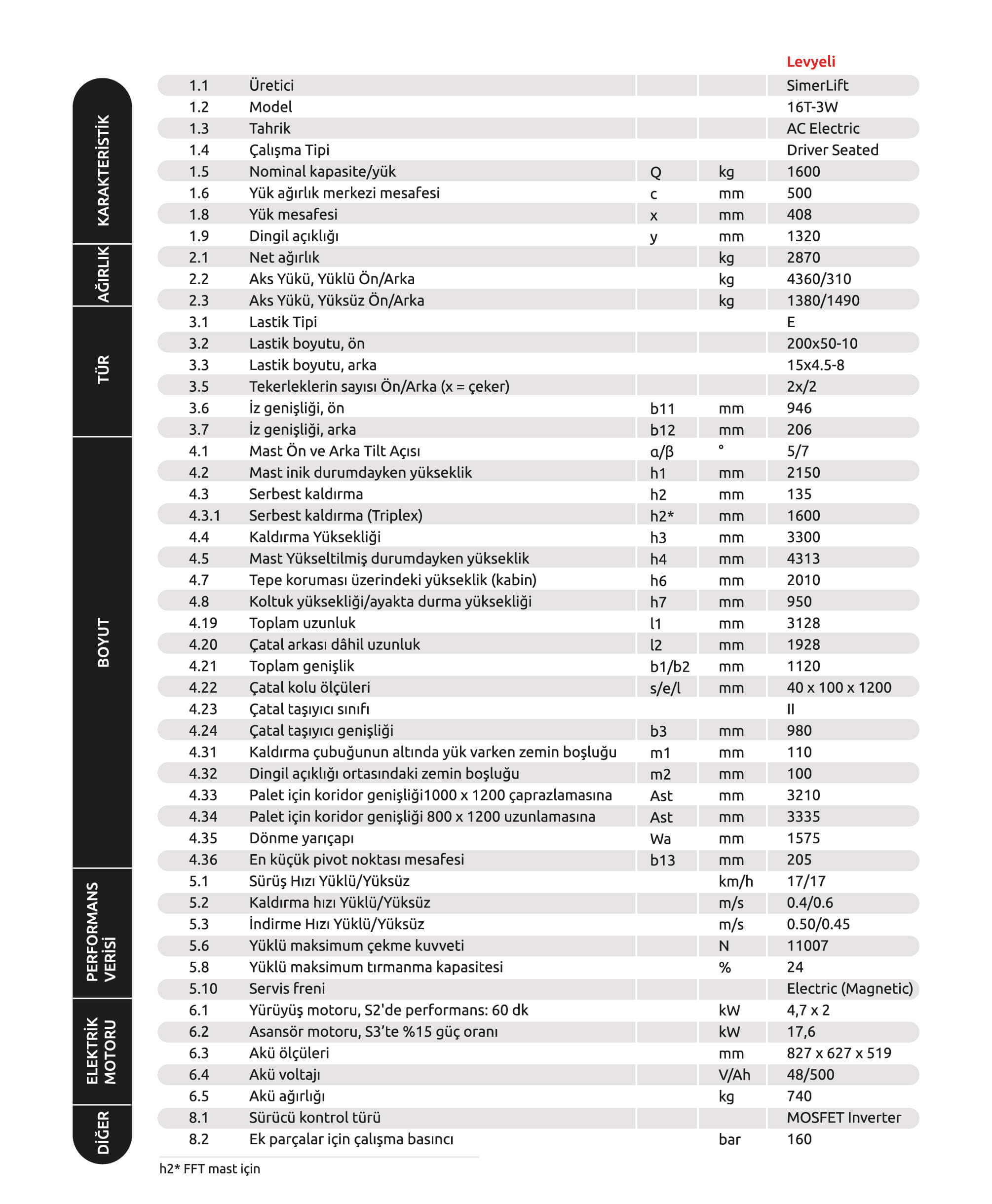 - Yüksek Taşıma Kapasitesi: 500 mm’lik yük ağırlık merkezine sahip, 1,6 tonluk yük kapasitesi.